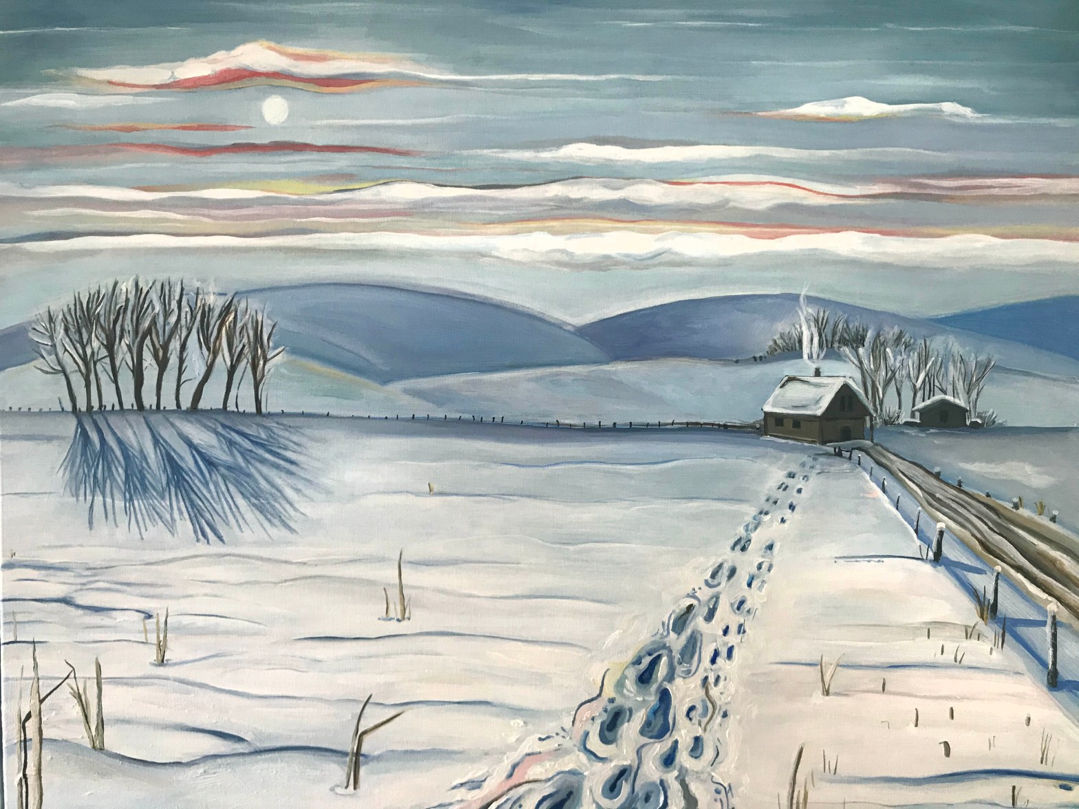 Piecing the landscape together, the painting revealed itself to me one sitting at a time. Sitting and looking, sitting and looking. Seeing where the light and shadows, colours and forms on the snowy plain were to lay. A lesson in perspective and a sharpening of the eye. When the last little bit of snow was placed and there was nothing left to add, the landscape spoke for itself.